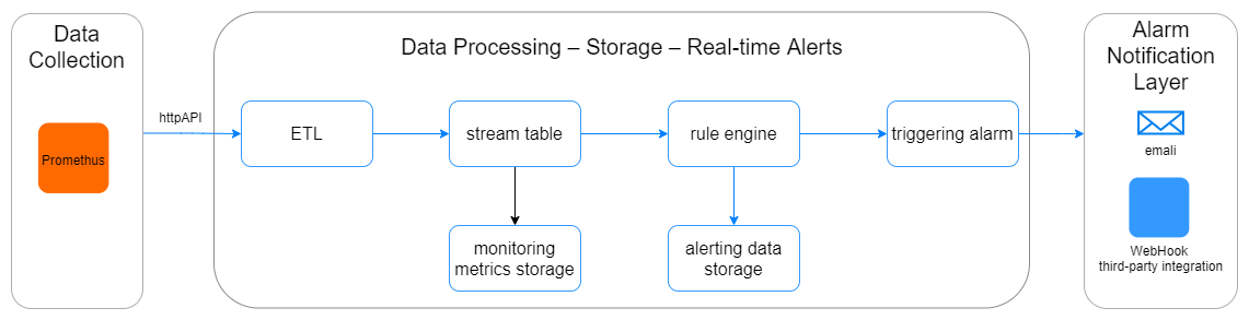 Real-time monitoring and alerting in one: The rule engine performs real-time computation on monitoring metrics, and plugins enable rapid integration with existing enterprise alerting systems.