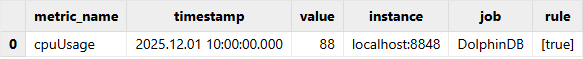 ruleEngine.append!(table("cpuUsage" as metric_name, datetime(2025.12.01 10:00:00) as timestamp, 88.0 as value, "localhost:8848" as instance, "DolphinDB" as job))
