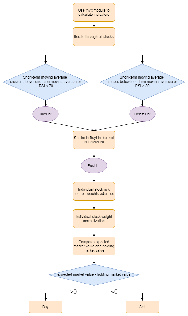 This strategy combines technical indicator signals with dynamic risk control mechanisms to screen and adjust stock portfolios, achieving risk control and return optimization. The overall trading logic is shown in Figure 2.1.