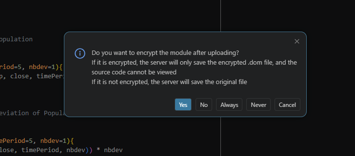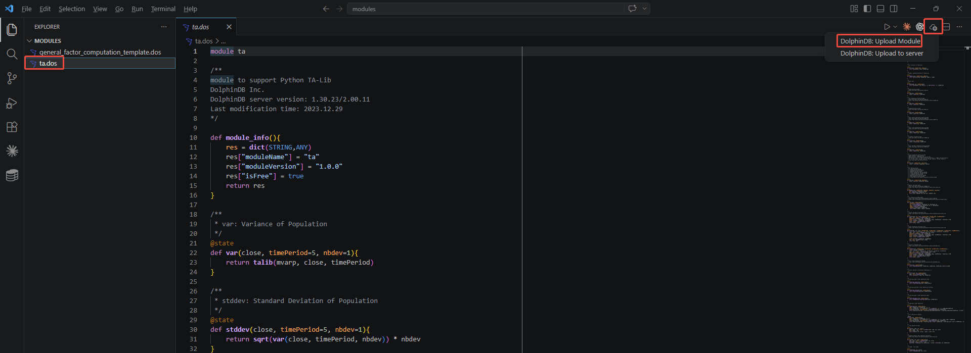 After you install the DolphinDB VSCode Extension, an upload icon appears in the upper-right corner of VSCode. First, select the module file to upload. Then, click Upload and select DolphinDB: Upload Module . In the dialog box, choose whether to encrypt the module. The detailed steps are shown in the figures below.
