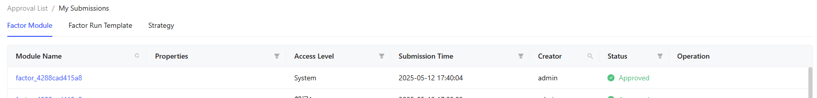 This module displays all publish requests submitted by the current user. It is divided into three tabs based on the type of submission: Factor Module, Factor Run Template, and Strategy.