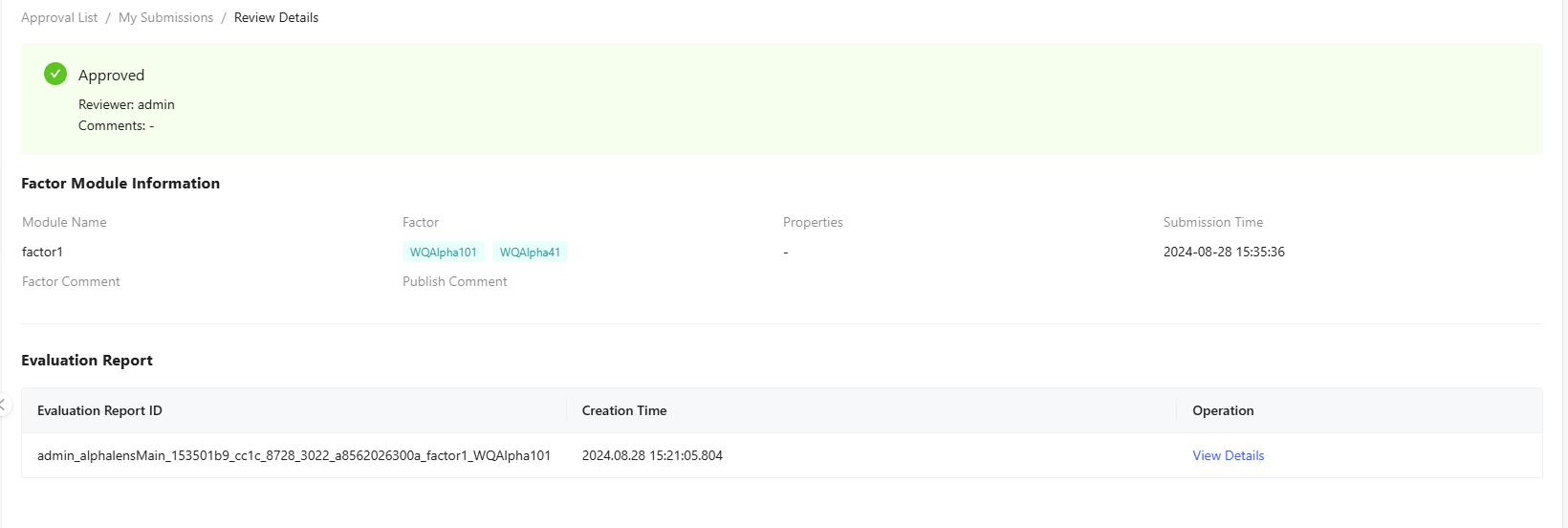 The pop-up displays the current approval status, factor module information, evaluation report, and factor code (if public to the approvers). Click View Details to see the full details of the evaluation report.