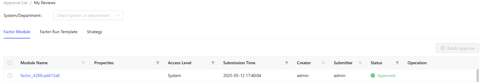 Department administrators can apply to publish the factor modules, factor run templates, and strategies public within the department to the system, allowing users with permissions in other departments to access them. It should be approved by system-level approvers.
