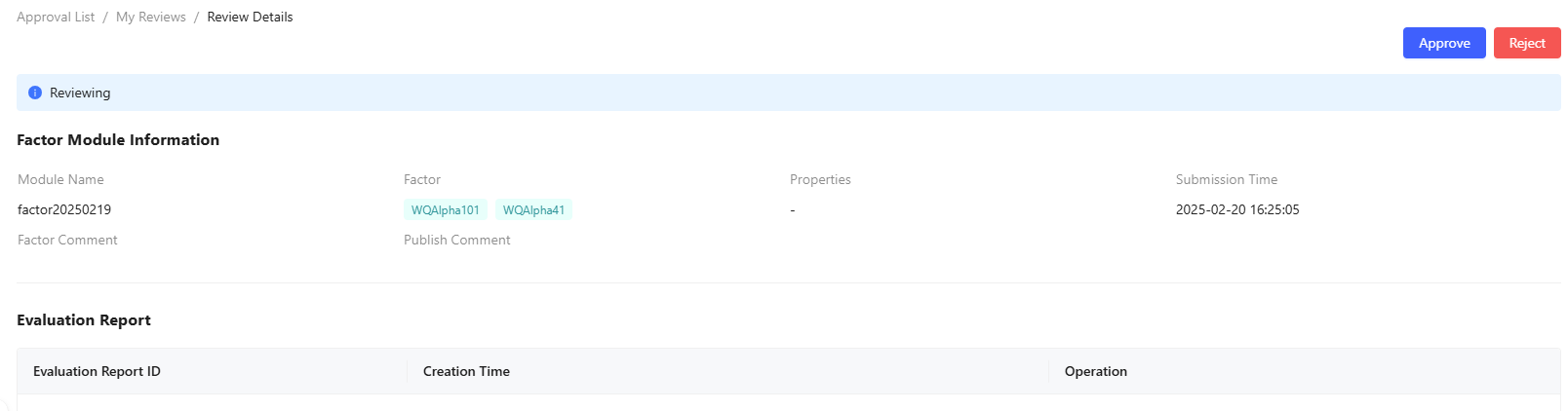 Taking the Factor Module as an example, it includes: module name, properties, submission time, access level, creator, status, and other relevant information.