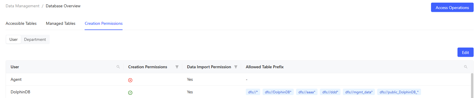 - Edit: Manage the database/table prefixes that users or departments are allowed to create.