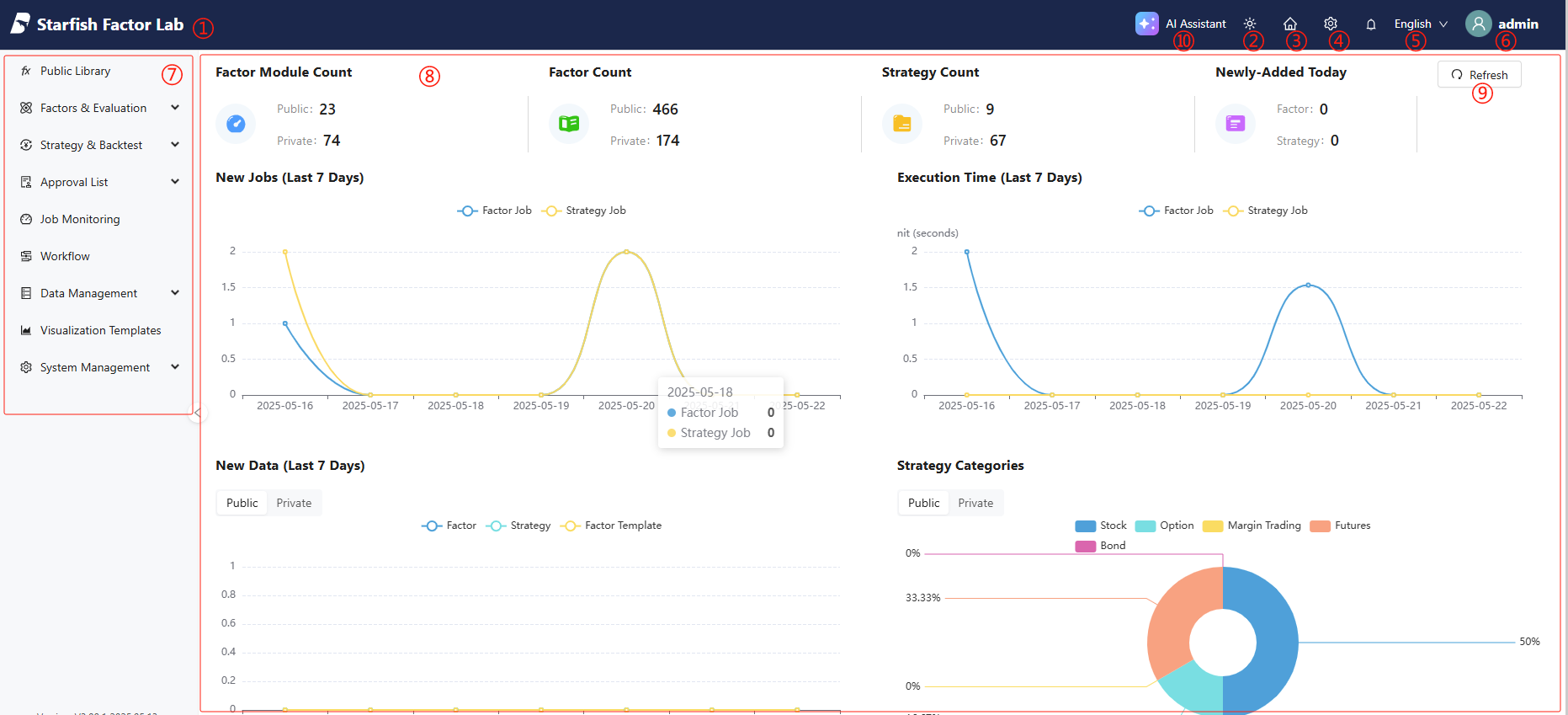 ⑧Displays information including factor module count, factor count (total number of factors of all modules), strategy count and categories, as well as recent updates.