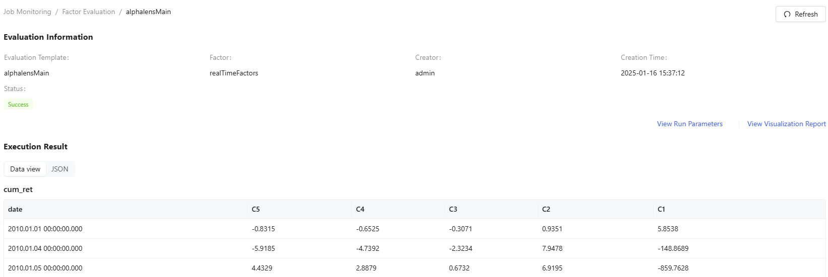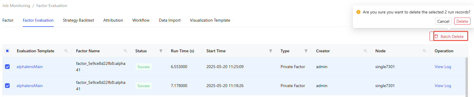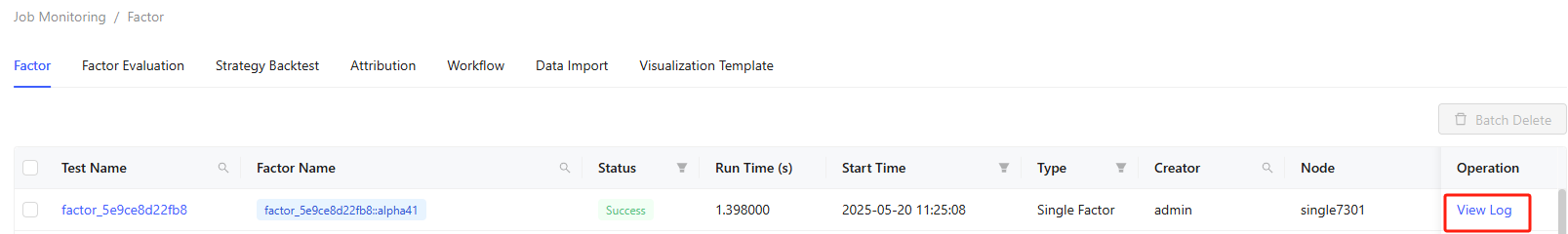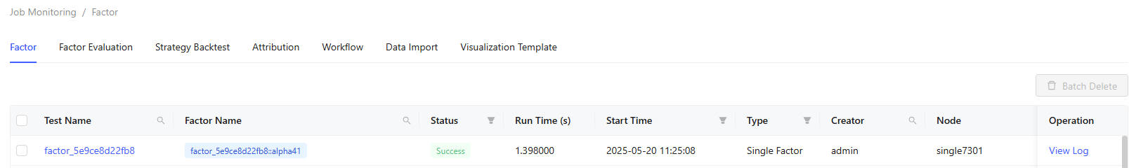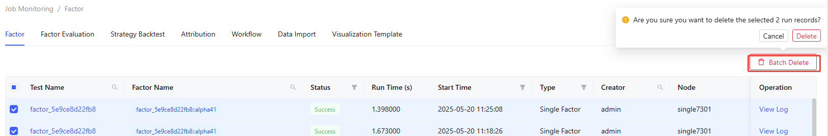 The Factor page shows execution history for all factors, including both private and public ones, along with those from batch tests and workflows. It shows details like test name, factor name, status, run time, start time, type, creator, and node.