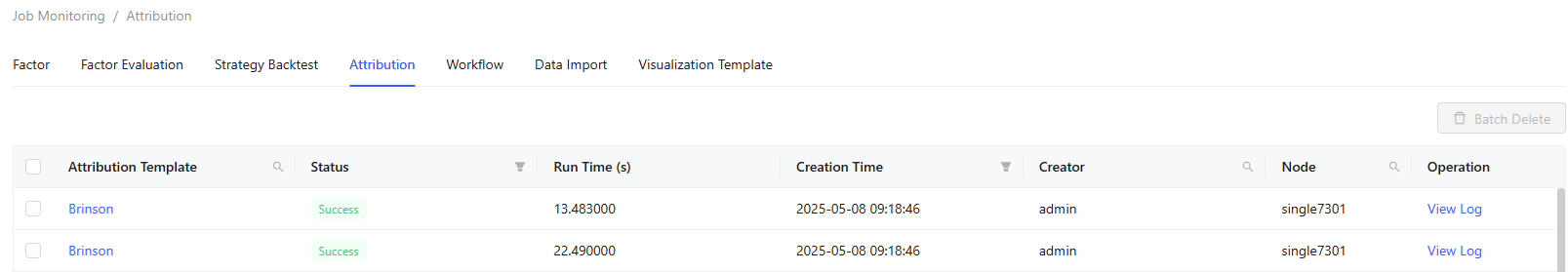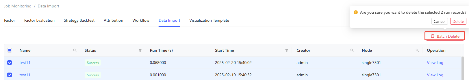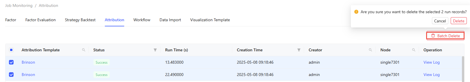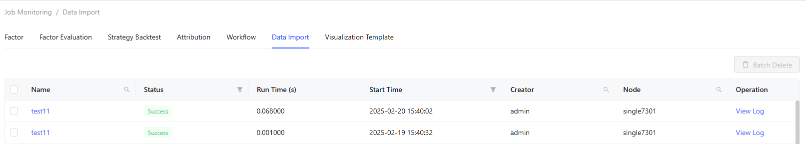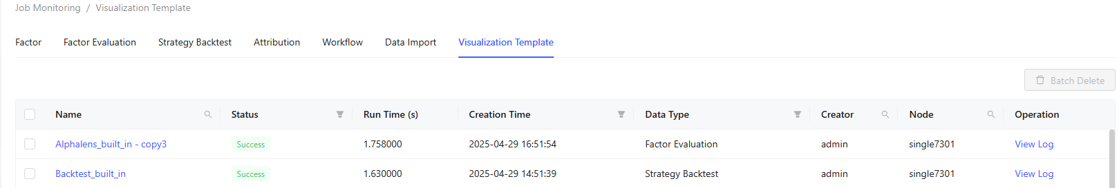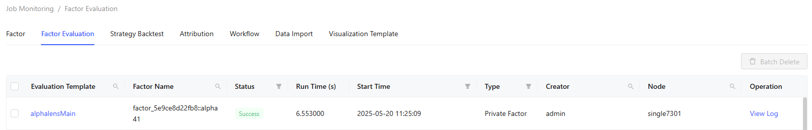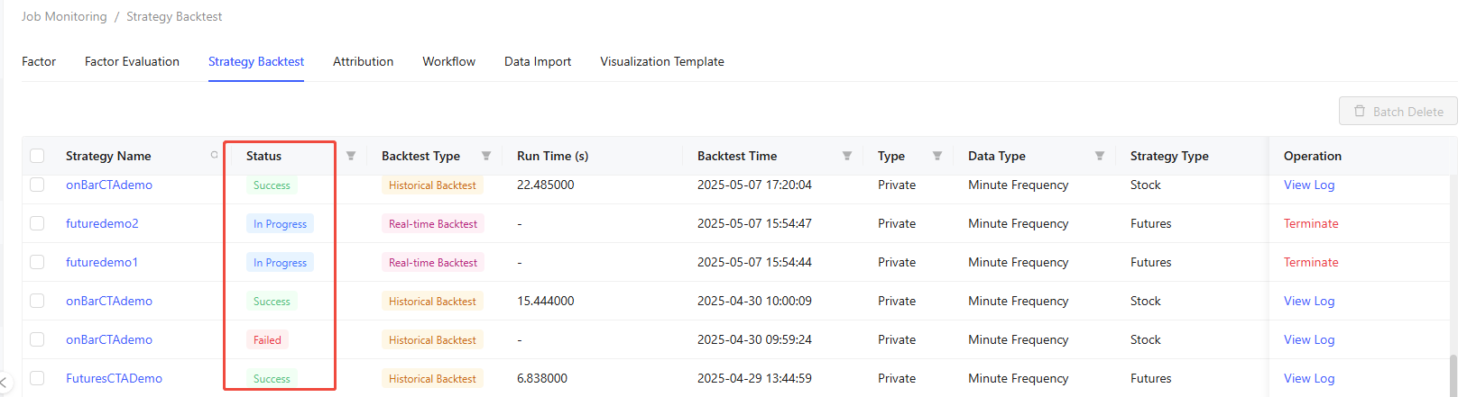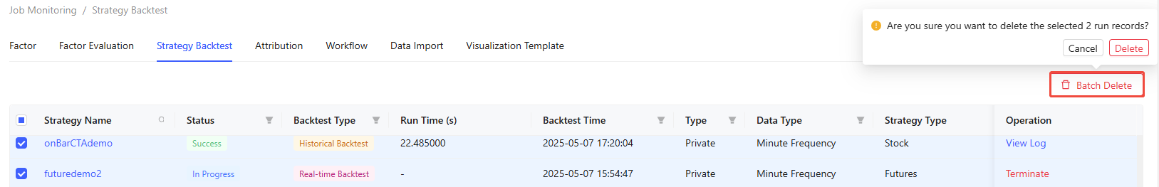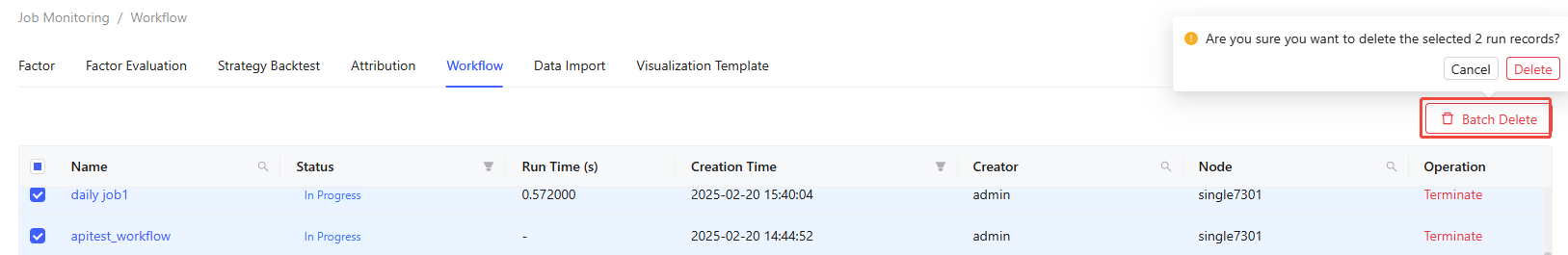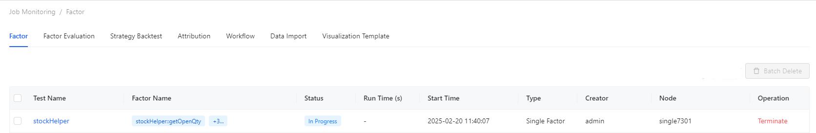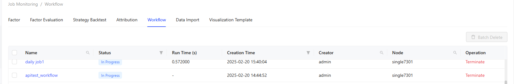 The Job Monitoring tab enables monitoring and management of different jobs, including Factor, Factor Evaluation, Strategy Backtest, Attribution, Workflow, Data Import, and Visualization Template.
