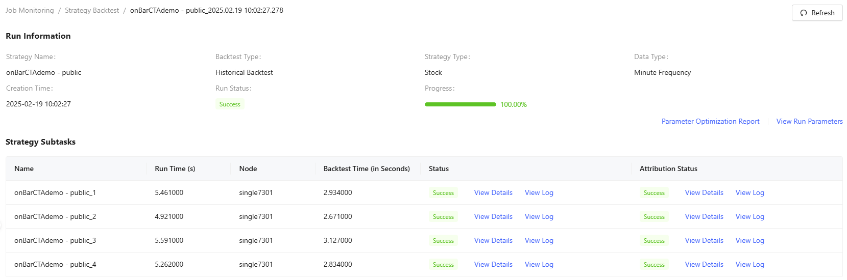 Strategy creators can access complete run information by clicking the strategyname. This opens a detailed view showing backtest results and logs for each strategy task, run parameters and parameter optimization report.