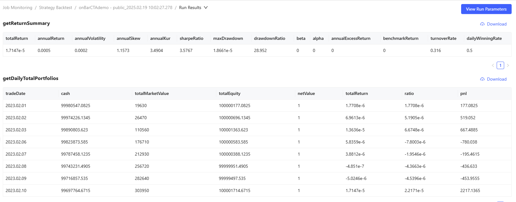 - You can download the corresponding results by clicking Download in the top-right corner of each table.