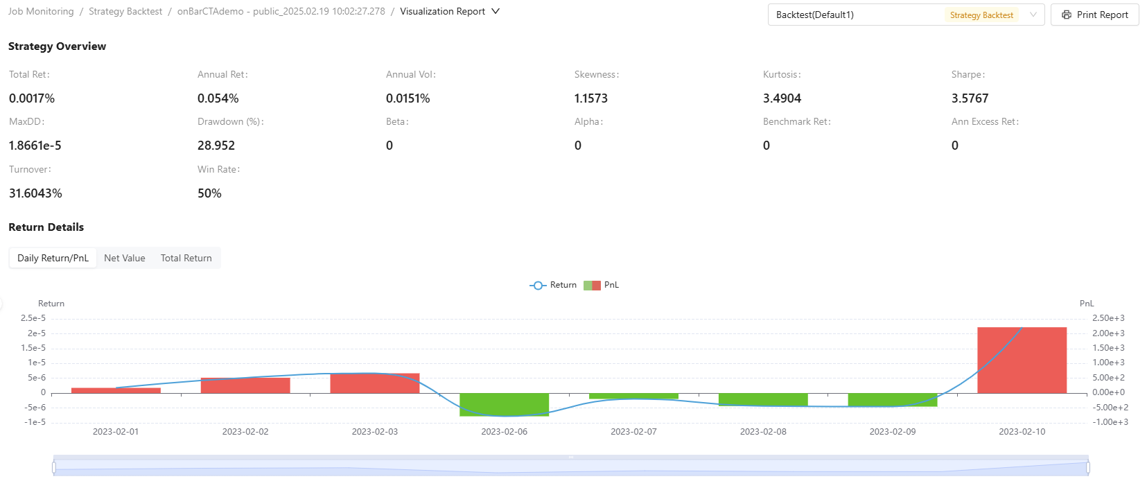 - Use the dropdown menu on the top to switch to the visualization report view. The visualization report includes six sections: overview, return details (covering daily returns, net value, and total returns), trade analysis (visualizing different signals), position details, account details, and order details. Each section displays the first 10 rows, with pagination available at the bottom to view more data. If there are more than 1000 records, data for a specific stock on a given day will be shown; otherwise, all available data will be displayed. You can filter by date or stock code. Additionally, you can choose a visualization template to present the data in different graphical formats.