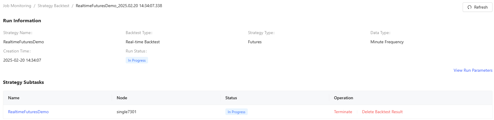 - Run Information displays detailed backtest strategy information, including strategy name, backtest type, strategy type, data type, creation time, run status and progress.