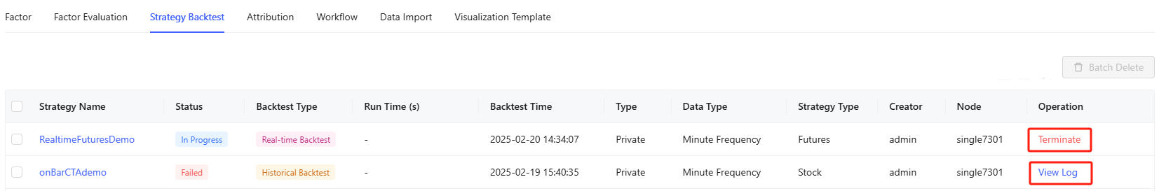 The Strategy Backtest page shows execution history for all backtesting strategies, including those from workflows. It shows details like strategy name, status, backtest type, run time, backtest time, type, data type, strategy type, creator, and node.