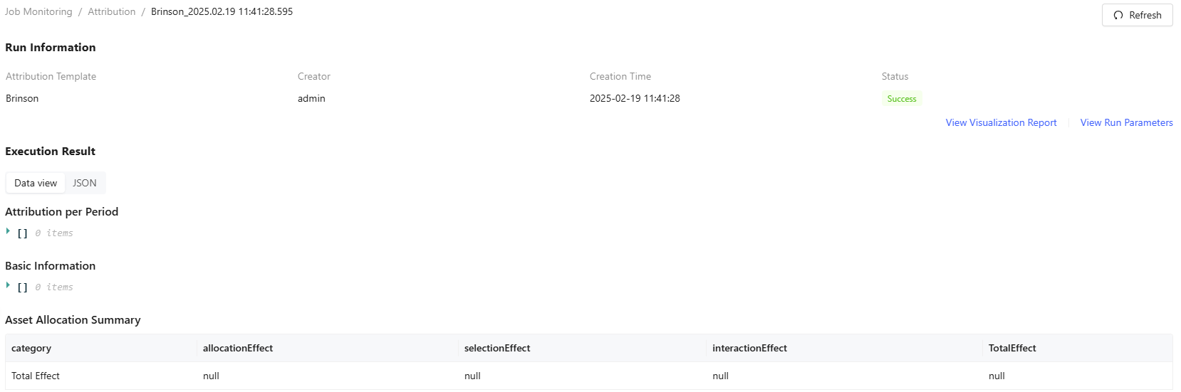 Template creators can access complete run information by clicking the templatename. This opens a detailed view showing attibution result, run parameters and visualization report.