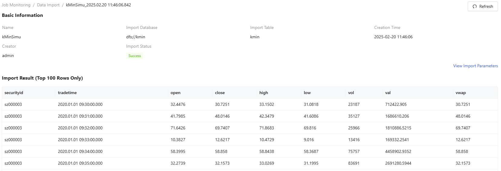 Data Import creators can access complete run information by clicking thename. This opens a detailed view showing import results and import parameters.