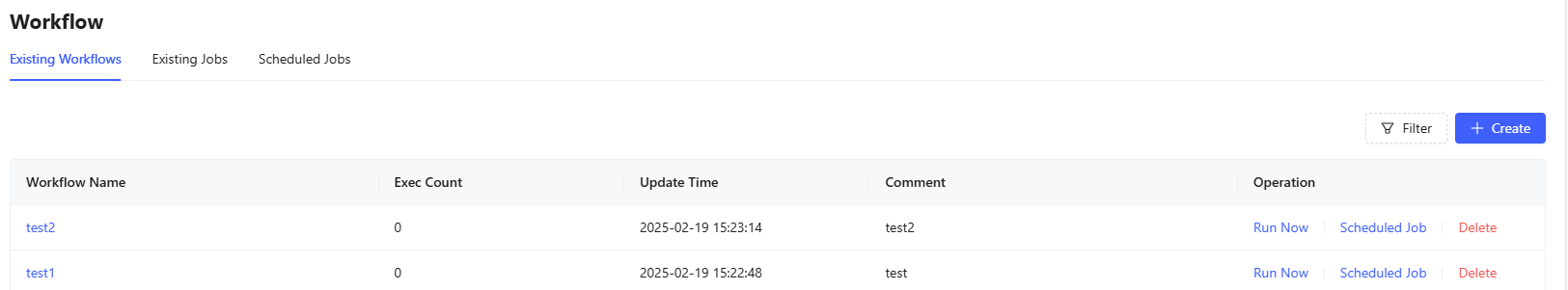 - Filter: Filters can be applied based on any column in the table, excluding the Operationcolumn. Click Query to filter workflows that meet the criteria.