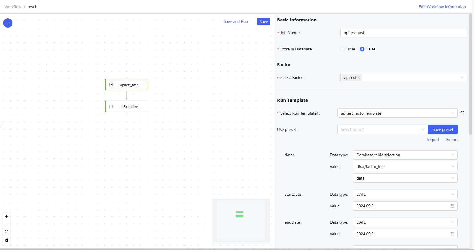 - Click a job within the workflow to view its detailed information on the right side, including: basic information, factor, and run template.