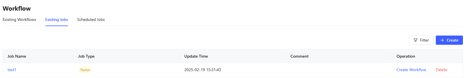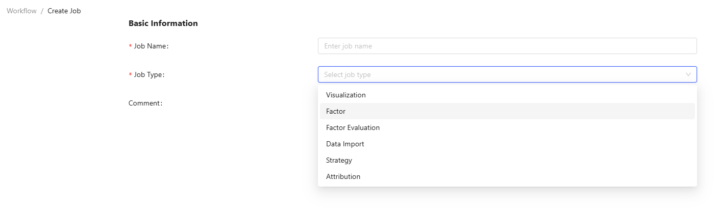 - Create: Create a new job. Select the job type and enter the job name and comment (optional) to describe the workflow. Click Create to finish creating. Depending on the job type, users must select the corresponding template, factor, or strategy.
