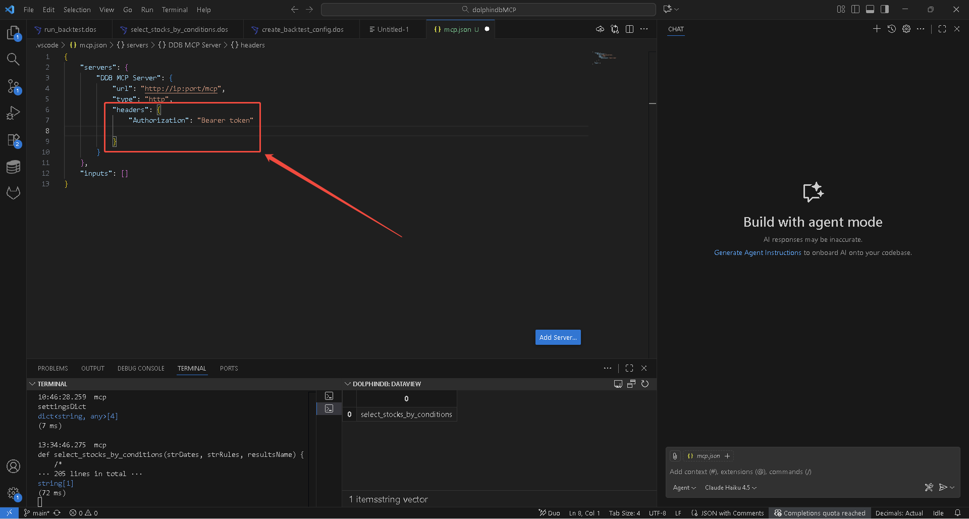 { "mcpServers": { "DolphinDB数据库助手": { "type": "http", "url": "http://your-server-ip:port/mcp", "headers": { "Authorization": "Bearer YOUR_TOKEN_HERE" } } } }配置说明: