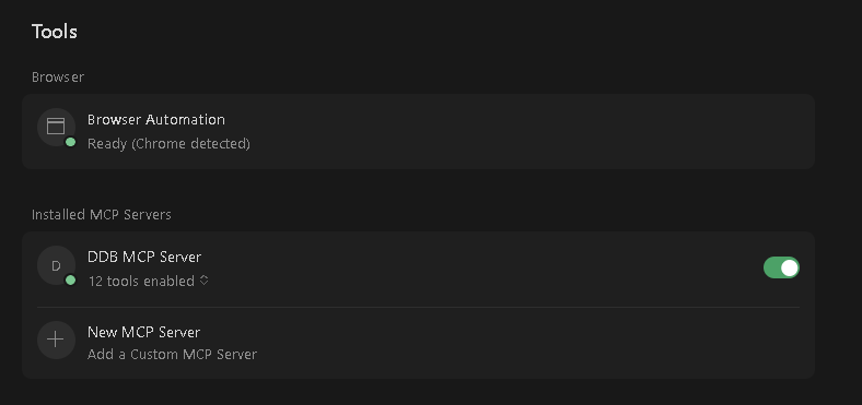 { "servers": { "DDB MCP Server": { "url": "http://ip:port/mcp", "type": "http", "headers": { "Authorization": "Bearer token" } } }, "inputs": [] }注:-