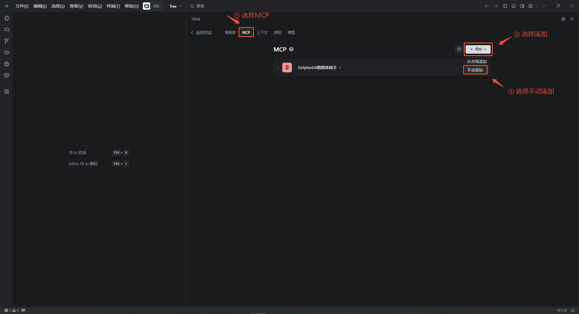 选择“MCP”,点击右上角“添加”,选择“手动添加”。