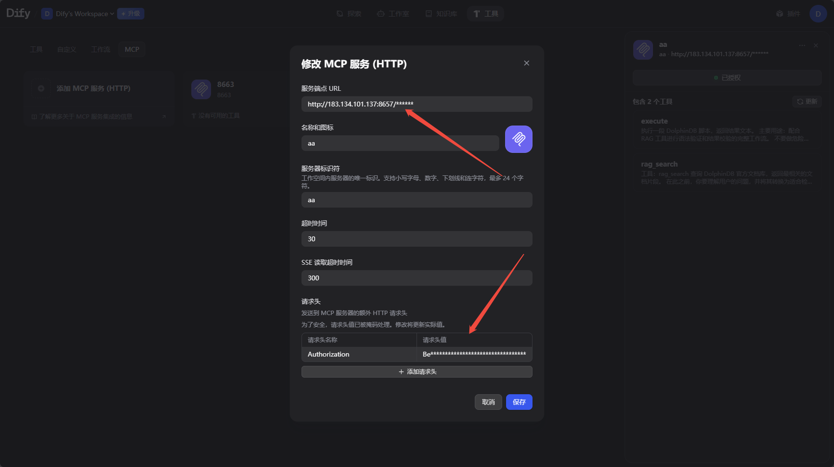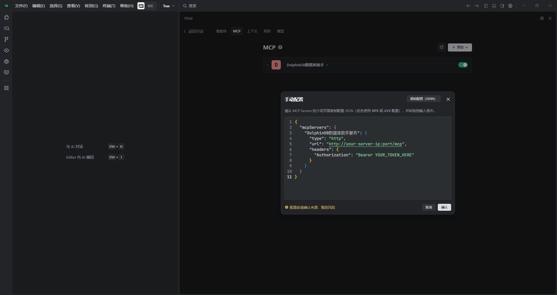 your-server-ip替换为 DolphinDB 服务器的实际地址,必须以 /mcp 结尾。 - 将