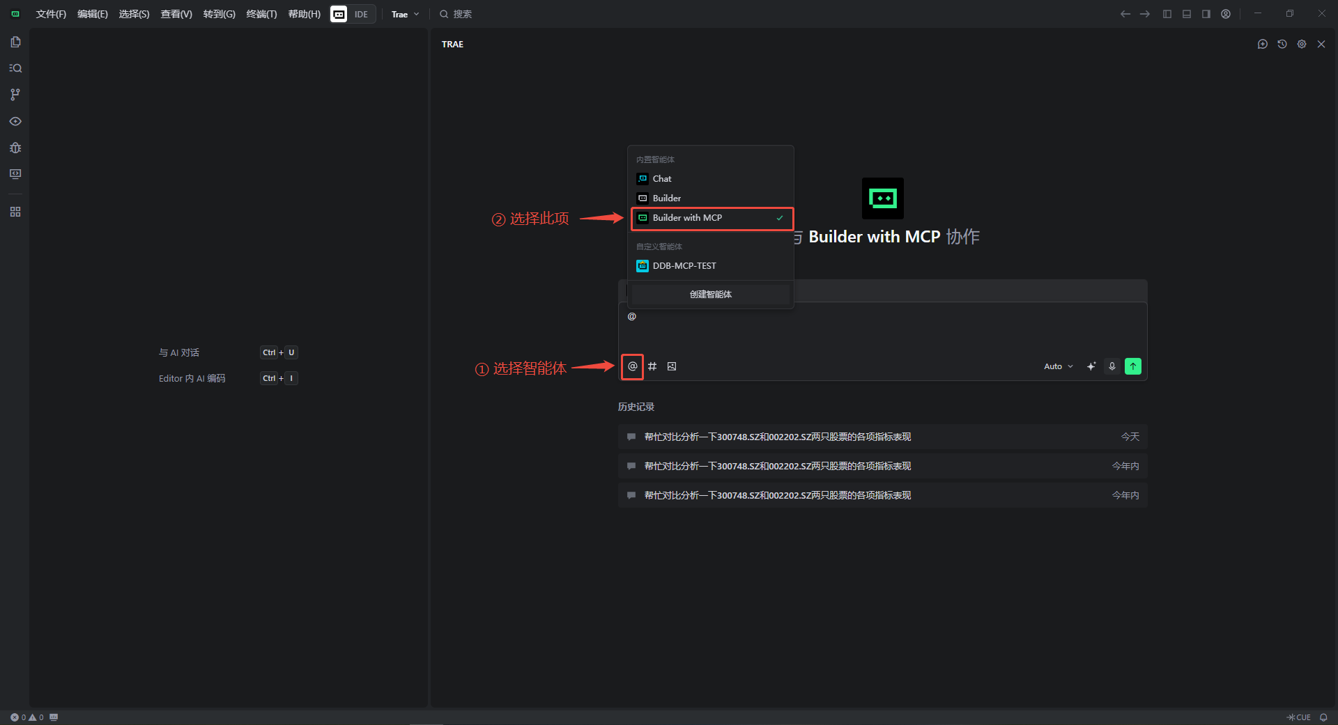 完成后点击返回对话界面,点击下方的“@”选择智能体,选择 Builder with MCP,即可开始使用 MCP 服务。