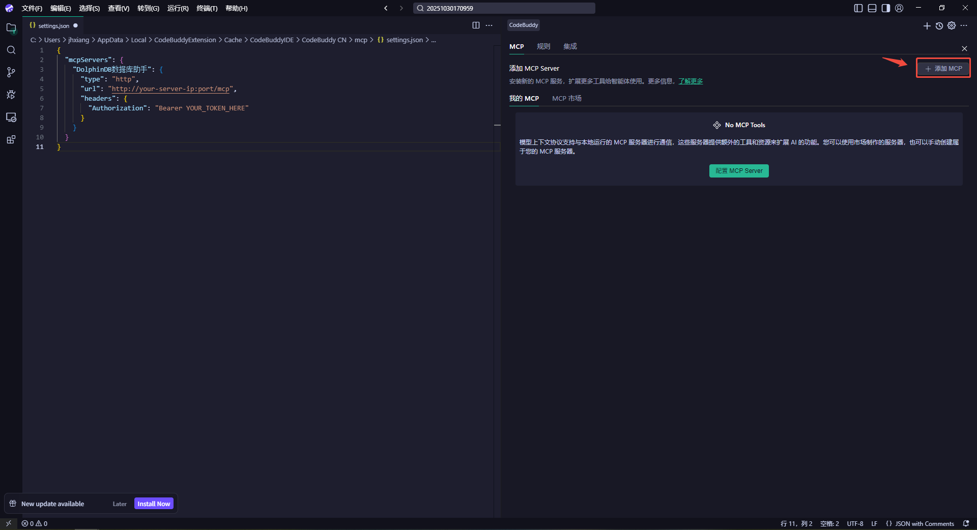 根据 MCP Server 的 URL 和 Token,在 JSON 文件中填写相应信息并保存。