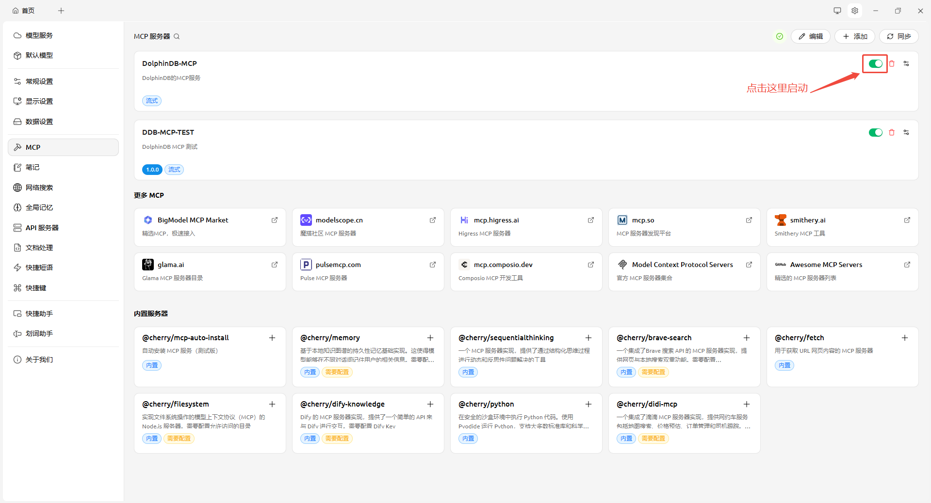 返回 MCP 设置界面,即可看到添加的 MCP 服务器,并启动该服务。