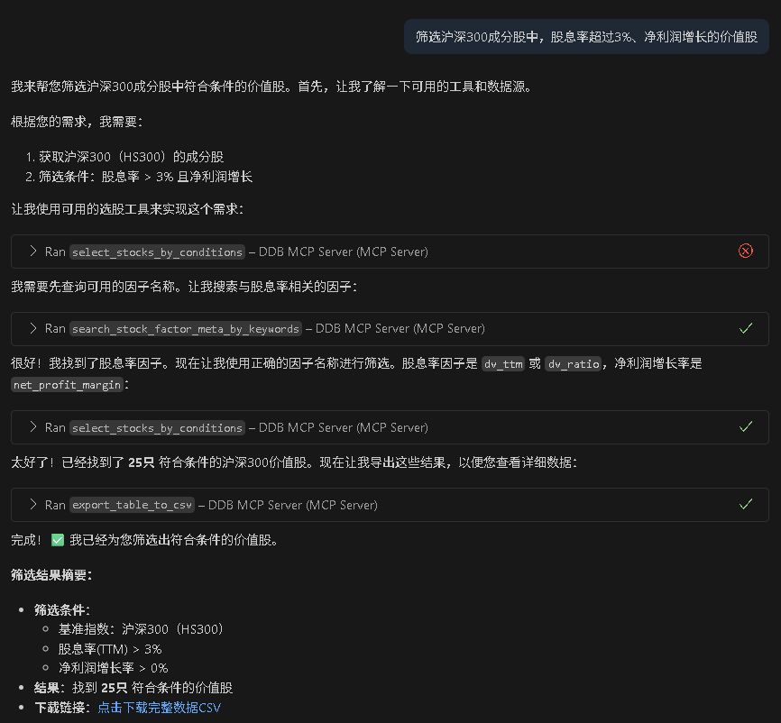 每次 Agent 调用工具时,计算在 DolphinDB MCP 服务端完成。客户端只负责保存输入参数和计算结果的上下文,无需参与实际计算。