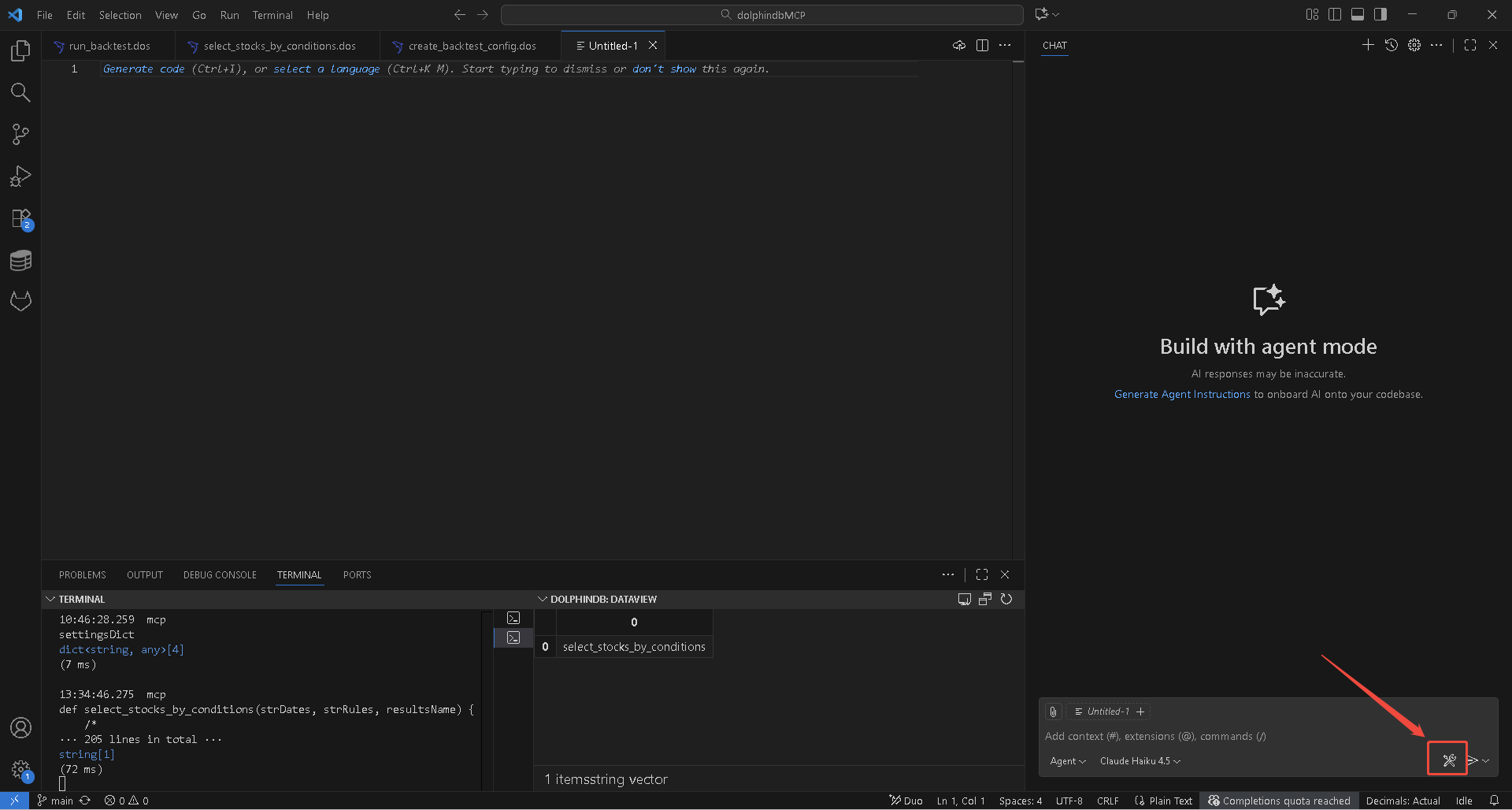 配置服务器完成后,在 “话题” 界面下新建话题,在上方选择模型,在下方侧栏中选择 DolphinDB 的 MCP 服务,即可开始使用 MCP 功能。