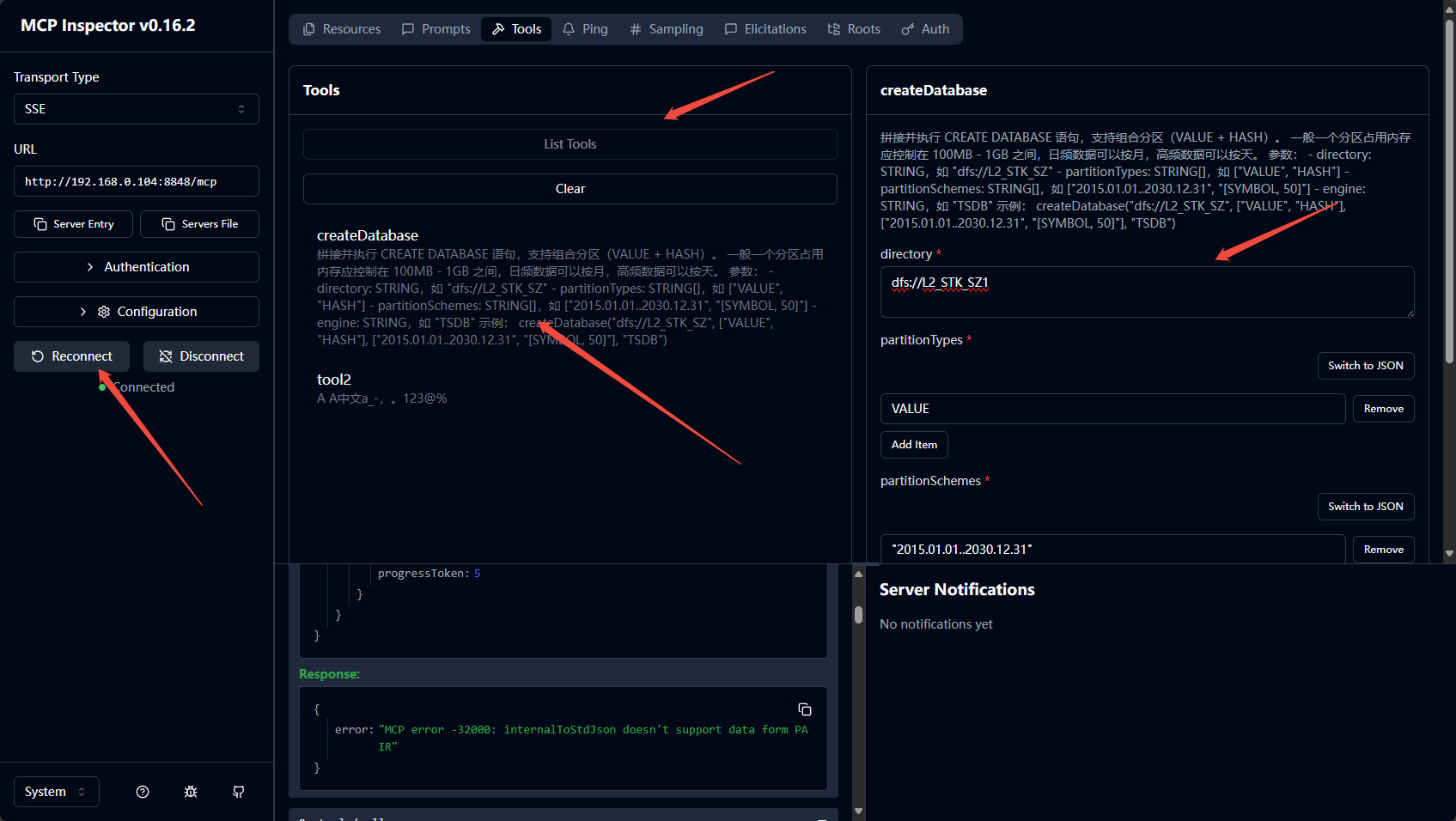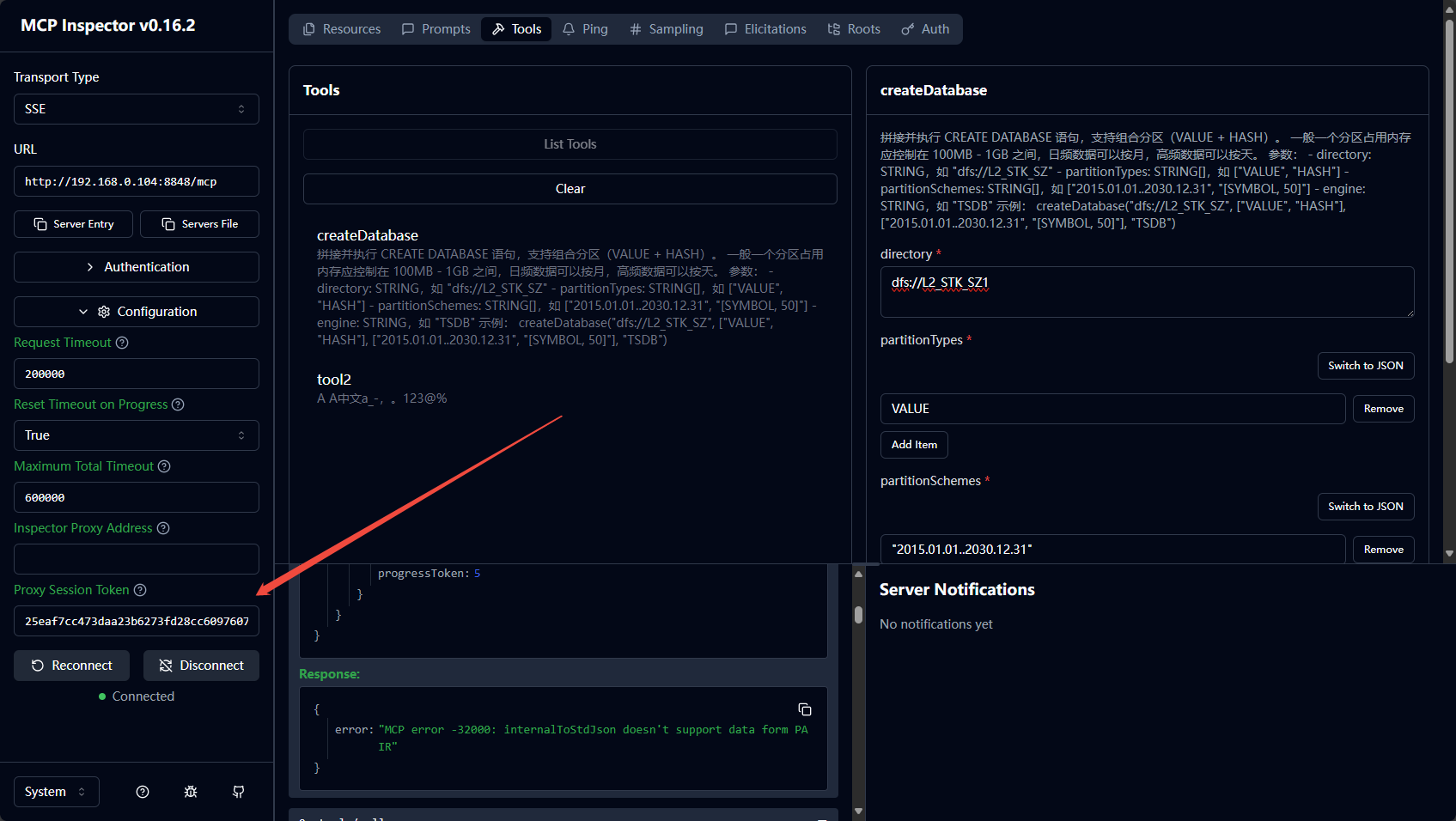 - 点击 List Tools 显示服务器发布的所有 MCP 工具。