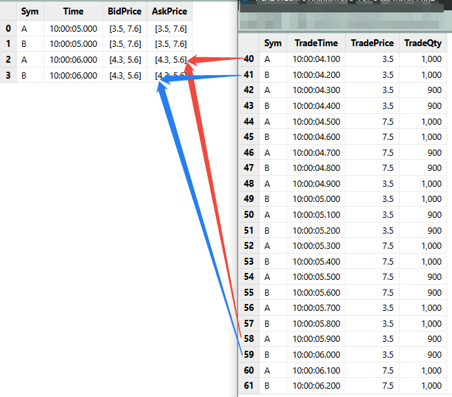引擎参数 useSystemTime=false 表示通过数据中的时间列(左表为 Time 字段,右表为 TradeTime 字段)作为时序标准进行关联计算。