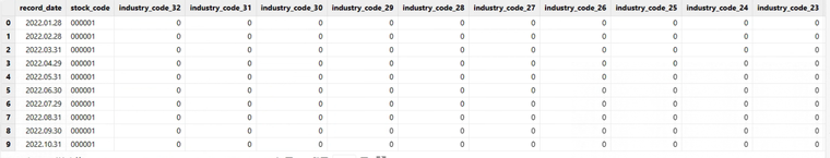 获取原始行业因子步骤一:获取月末交易日和行业交易代码。步骤二:基于交易日数据获取行业数据。步骤三:基于 onehot 编码生成宽表并求和汇总。 |