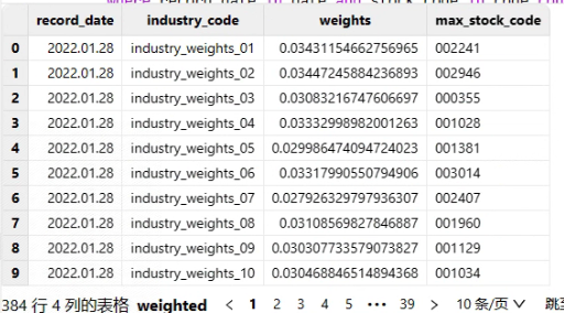 获取行业因子权重步骤一:获取月末交易日和行业交易代码。步骤二:基于交易日数据获取各行业数据、市场数据。步骤三:关联上述两表,计算每个行业占总行业的权重,并找出在指定行业中占比最大的个股。 |