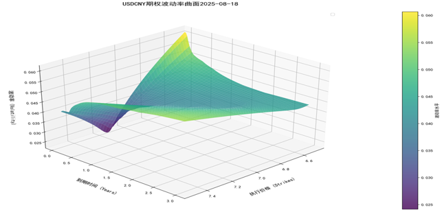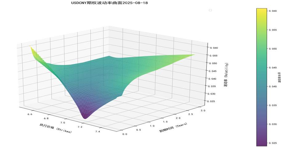 以外汇交易中心 2025 年 8 月 18 日数据为例,选取 USDCNY 外汇期权 delta 报价矩阵为参数,SVI 模型拟合波动率微笑,得到了外汇波动率曲面,该曲面可用作外汇期权的定价。