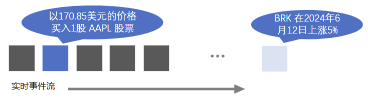 在 CEP 系统中,事件是一段时间内发生的特定事情或状态的数据表示,是描述对象变化的属性值的集合。例如“以170.85美元的价格买入1股 AAPL 股票”和“BRK 在2024年6月12日上涨5%”都是事件。它源源不断地产生,并以流的形式存在。