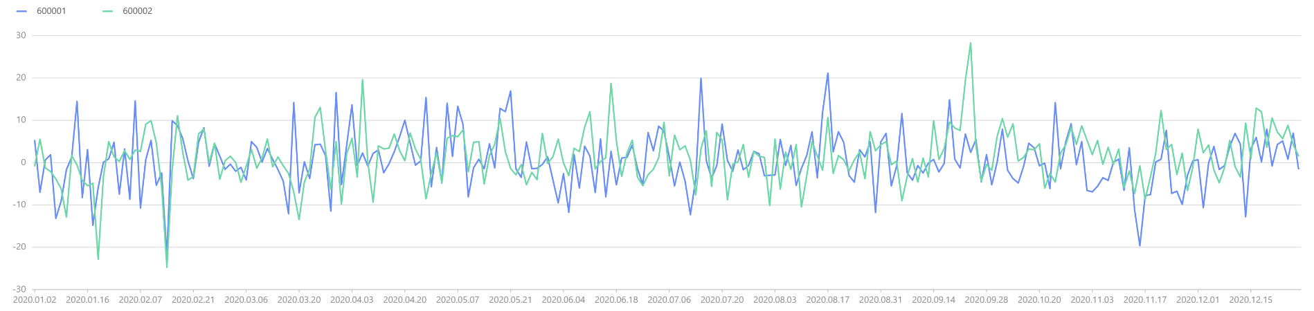 以第 4 部分中的数据为例,如下绘制 600001、600002 两只股票的股票收益率时序图如下。