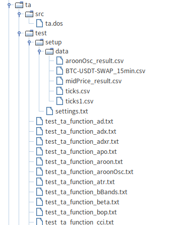 ,其下有 src 和 test 两个子目录。src 目录包含 ta.dos 模块的源码,该模块封装了一系列函数。test 目录用于测试 ta.dos 中的函数,包含 setup 目录和以 test_ta_function_*.txt 命名的测试用例文件,